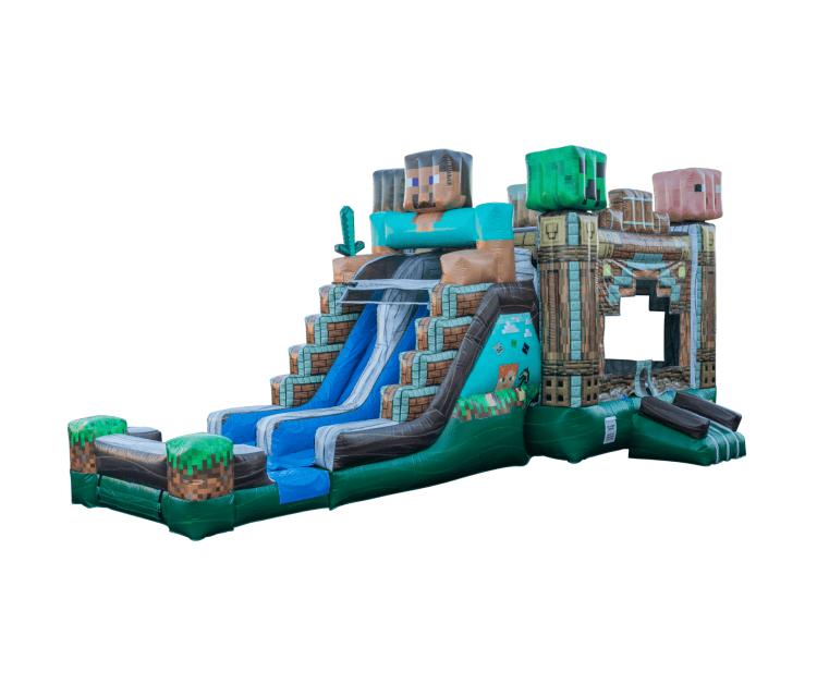 Step into a world of blocks and imagination with our Mindcraft Combo! Designed with vibrant, pixelated graphics and a bold 3D layout, this action-packed inflatable features a spacious bounce area and an epic dual-lane slide for nonstop fun.
