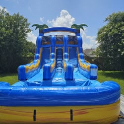 Turn up the fun with Riptide Rush— a vibrant tropical water slide that brings high-energy thrills right to your backyard! With bold yellow and blue colors, palm tree details, and dual racing lanes, this 15-foot slide is all about fast-paced action and refreshing splashes. It’s the perfect way to beat the heat and bring beach-day excitement to any party.