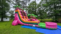 Introducing the Aloha Blast—a vibrant 18-foot tropical water slide that turns any backyard into a party paradise! With a bold splash of pinks, greens, and neon Hawaiian print, this island-themed slide is just as exciting to look at as it is to ride.