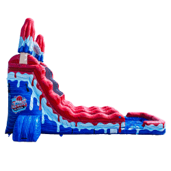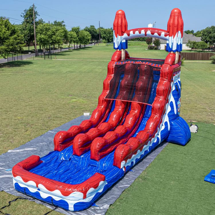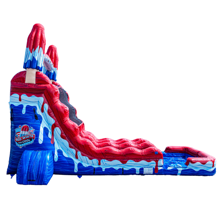 Introducing Red White & Cool — a bold 18-foot dual lane water slide packed with patriotic colors and frozen-treat fun! With bright red, white, and blue waves, playful melting drip designs along the sides, and giant popsicles standing tall at the top, this eye-catching slide instantly turns any backyard into a cool summer celebration.